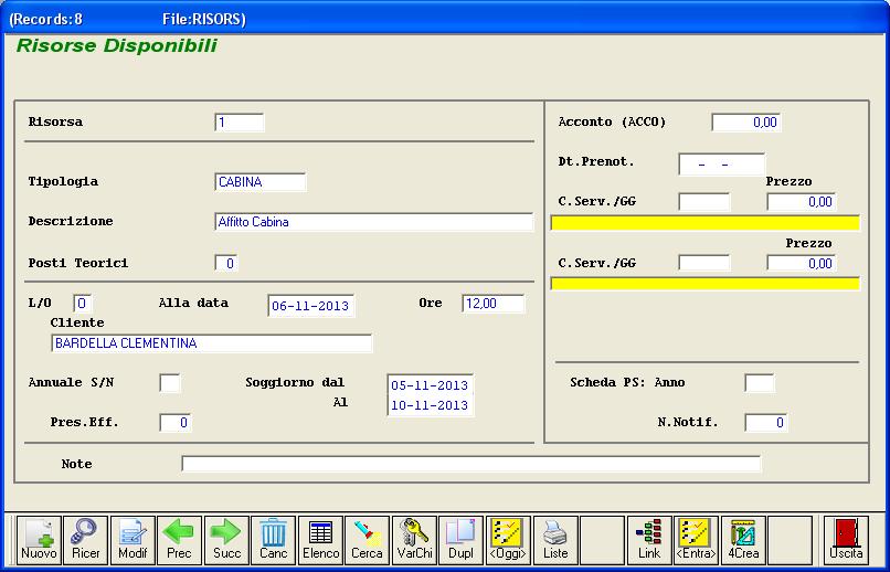 Il programma gestisce i problemi ricettivi di uno stabilimento balneare. Consente una gestione dei clienti completa e continua, assicurando le comunicazioni automatiche. Permette la definizione delle risorse disponibili (posto, ombrelloni, cabine, tende ecc..) nonchè la gestione delle prenotazioni. Prevede la contabilizzazione di tutte le prestazioni del bagno, noleggi, consumazioni, prestazioni accessorie, ecc...