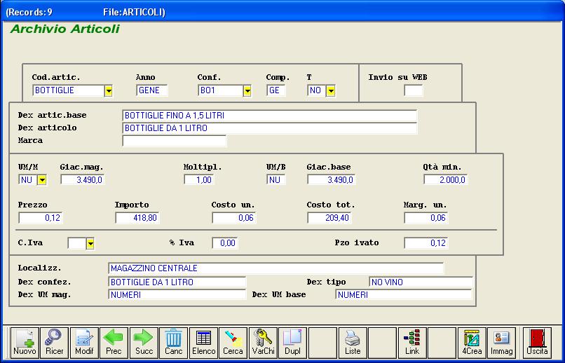 Preliminare, per l'utilizzo del programma, è la preparazione e l'aggiornamento di alcune banche dati di facile gestione. Di queste banche dati, le fondamentali sono le anagrafiche clienti e fornitori, le tabelle dei dati per l'applicazione dell'Iva e delle causali di magazzino, le tabelle dei vari tipi di alcool e delle confezioni.