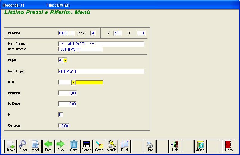 Gestione listino piatti con prezzi unitari e con le informazioni utili per la rilevazione dei menù